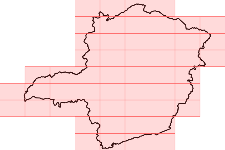 - A camada representa as folhas vetoriais da articulação 1:250.000, implementadas pelo INPE para estruturação e disseminação dos dados geomorfométricos do Topodata. Cada folha possui 1º de latitude por 1,5º de longitude. As folhas são codificadas, com base na posição do paralelo central que perpassa cada uma, para fins de orientação e organização. A articulação constitui, portanto, um mapa-índice para obtenção dos dados do Topodata conforme a localização pretendida. Nos atributos de cada feição correspondente às folhas, é possível realizar o download das cenas de cada produto (Altimetria, Declividade, Curvaturas vertical e horizontal, Formas do terreno, Divisores), por meio de hiperlinks que redirecionam a obtenção direto do repositório Topodata. As folhas vetoriais da presente camadas são as que intersecionam com o limite de MG.